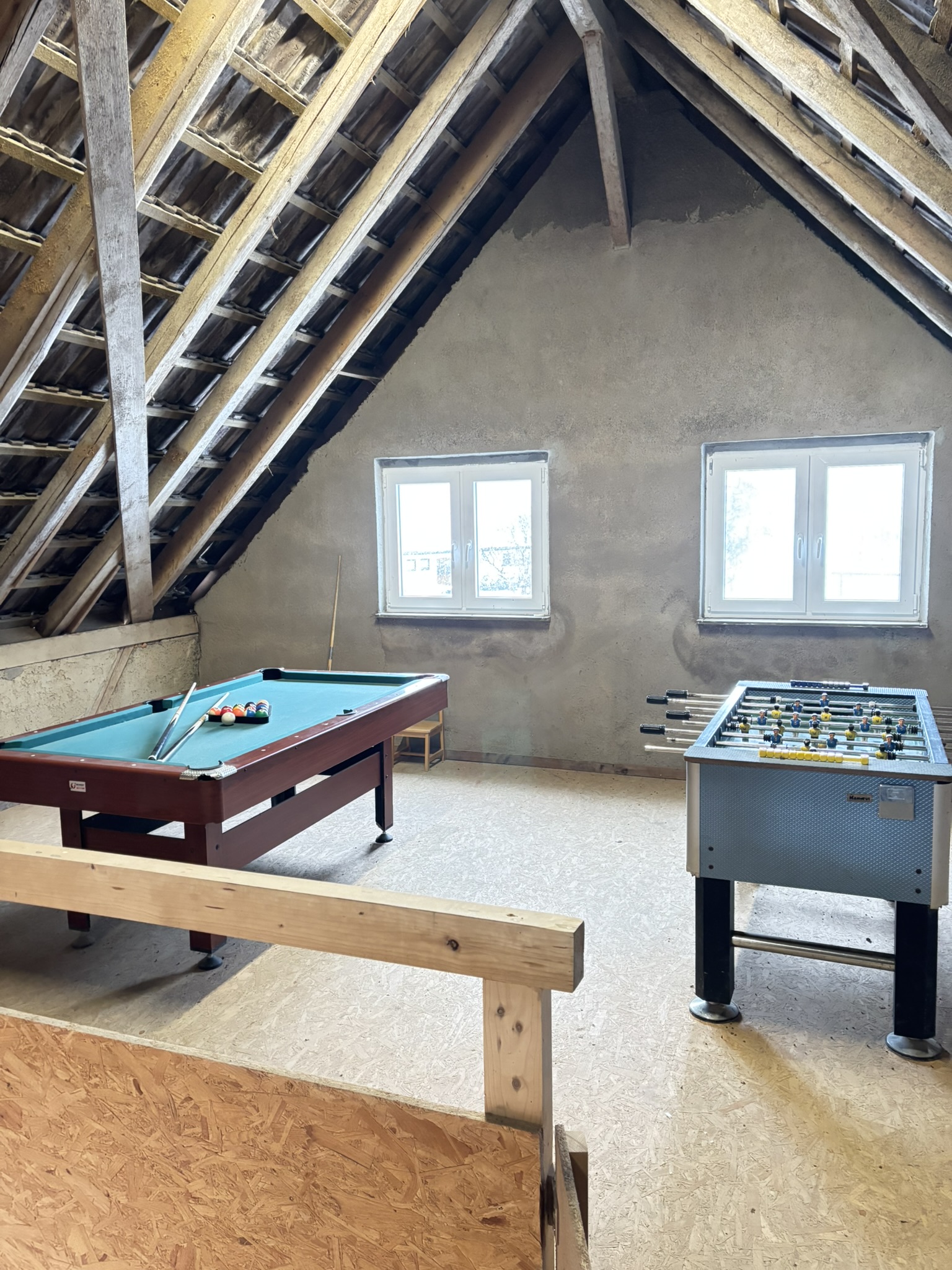 Ihr findet hier die tollsten Spielgeräte: Es gibt einen Tischkicker, eine Dartscheibe, eine tolle Tischtennisplatte und sogar einen Billard Tisch.
